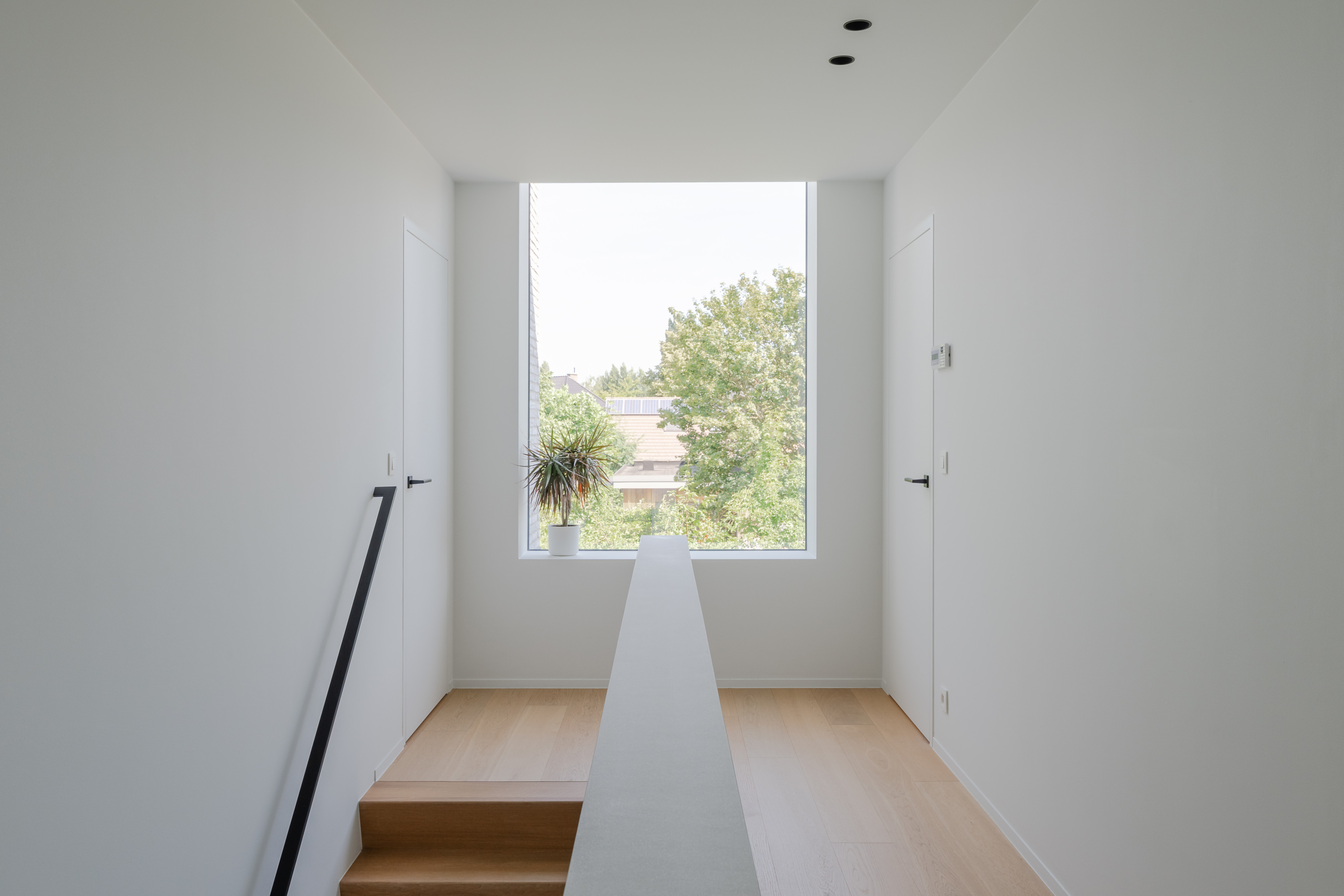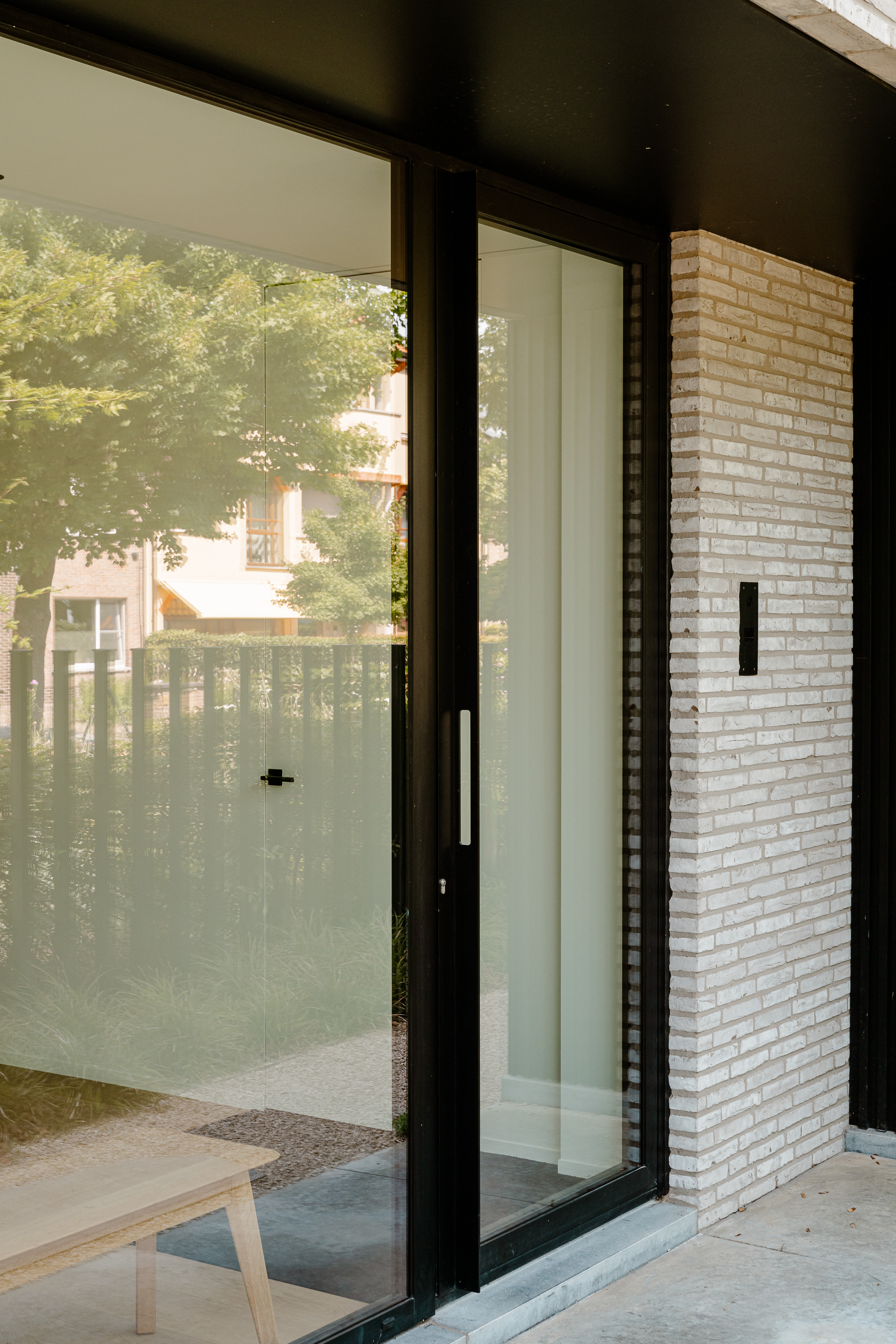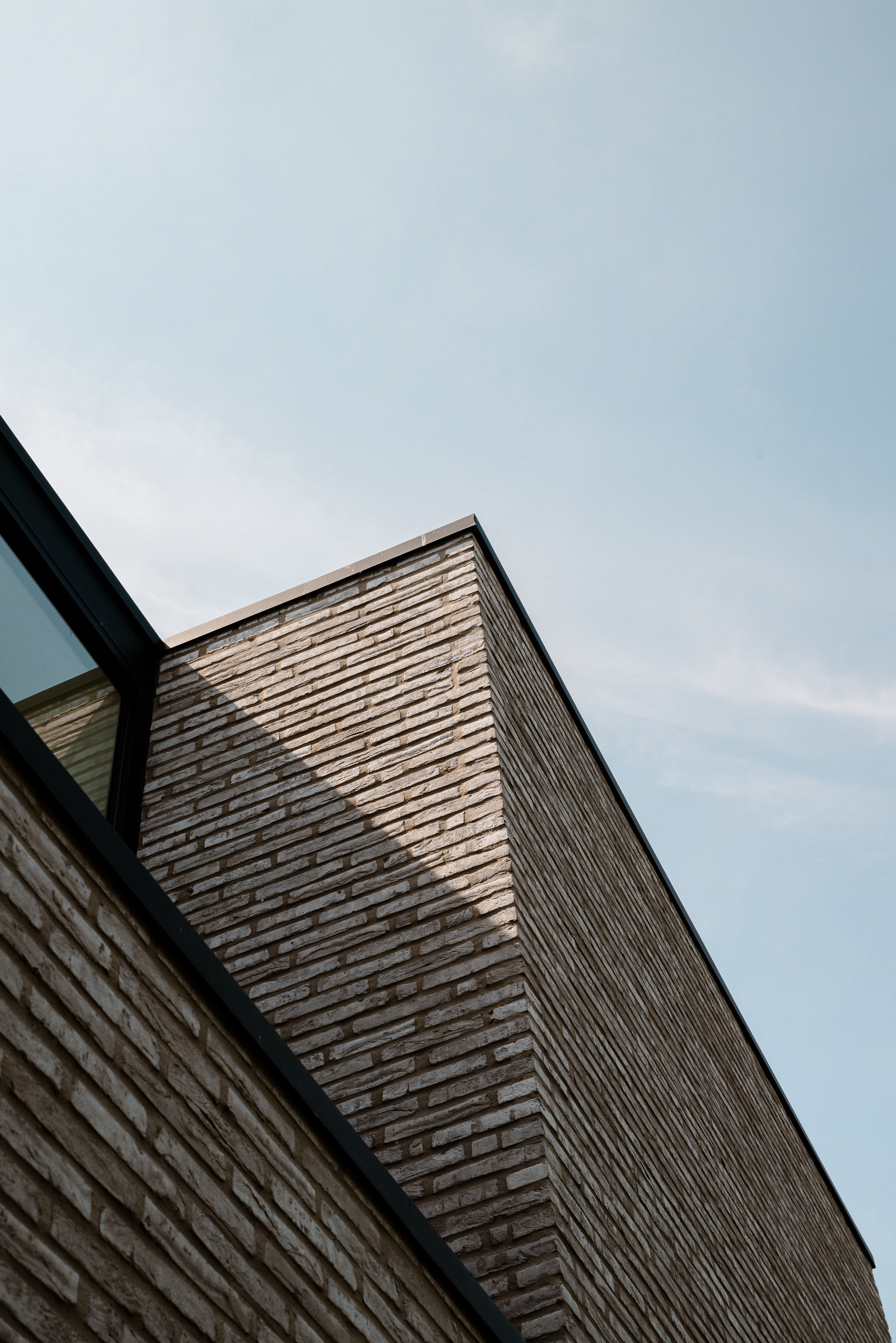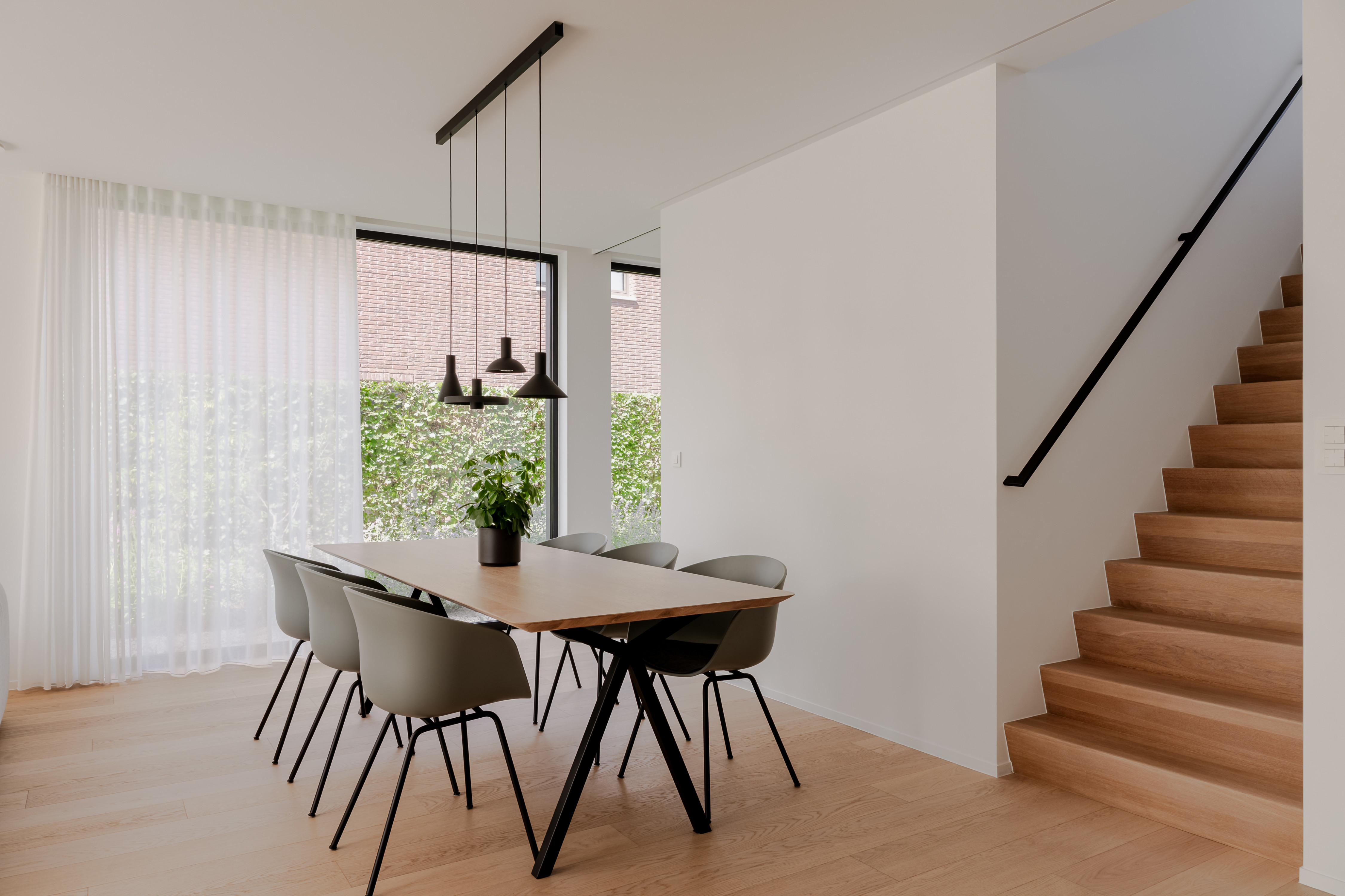 Deze nieuwbouw woning in Mariakerke is een perfecte balans tussen esthetiek en praktisch gebruiksgemak. De voorgevel speelt met volumes, waarbij de inkom en carport subtiel zijn geïntegreerd in het ontwerp. Aluminium gevelbekleding geeft de woning een moderne uitstraling en zorgt ervoor dat de fietsenberging naadloos in de gevel opgaat, wat de architecturale zuiverheid versterkt. Het doorlopende raam in de nachthal, dat doorloopt tot de dakrand, is een opvallend detail en accentueert het unieke karakter van de woning.