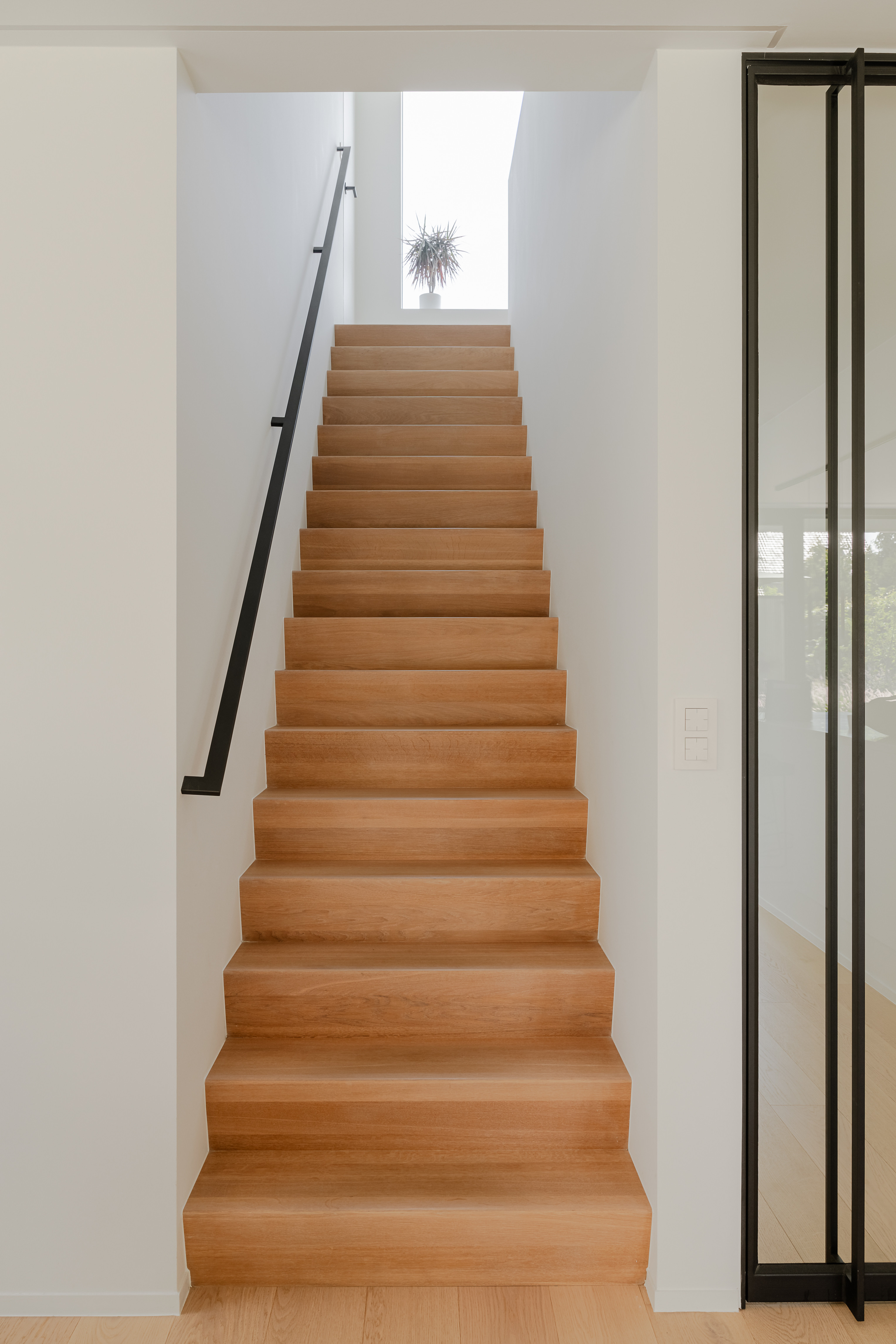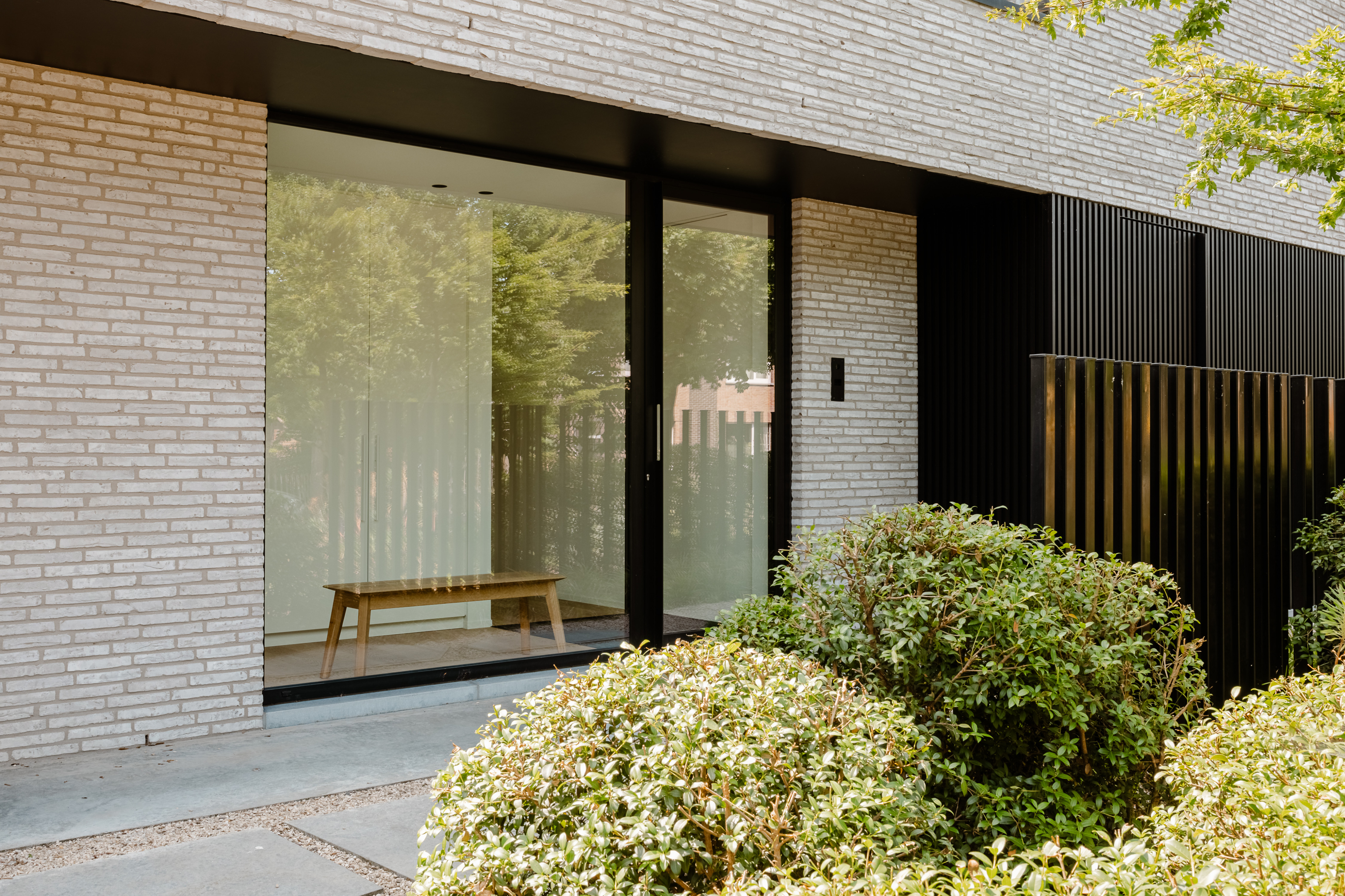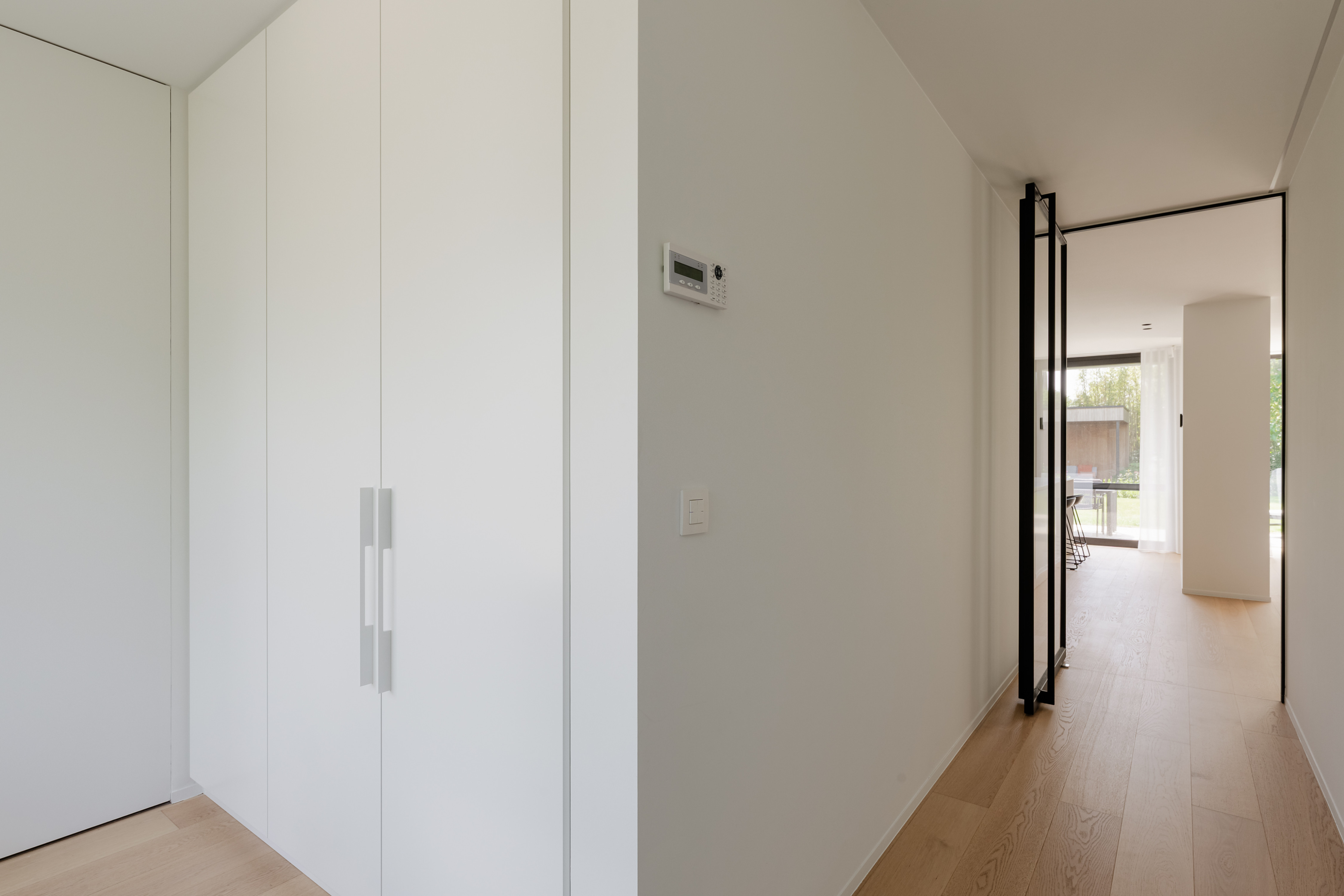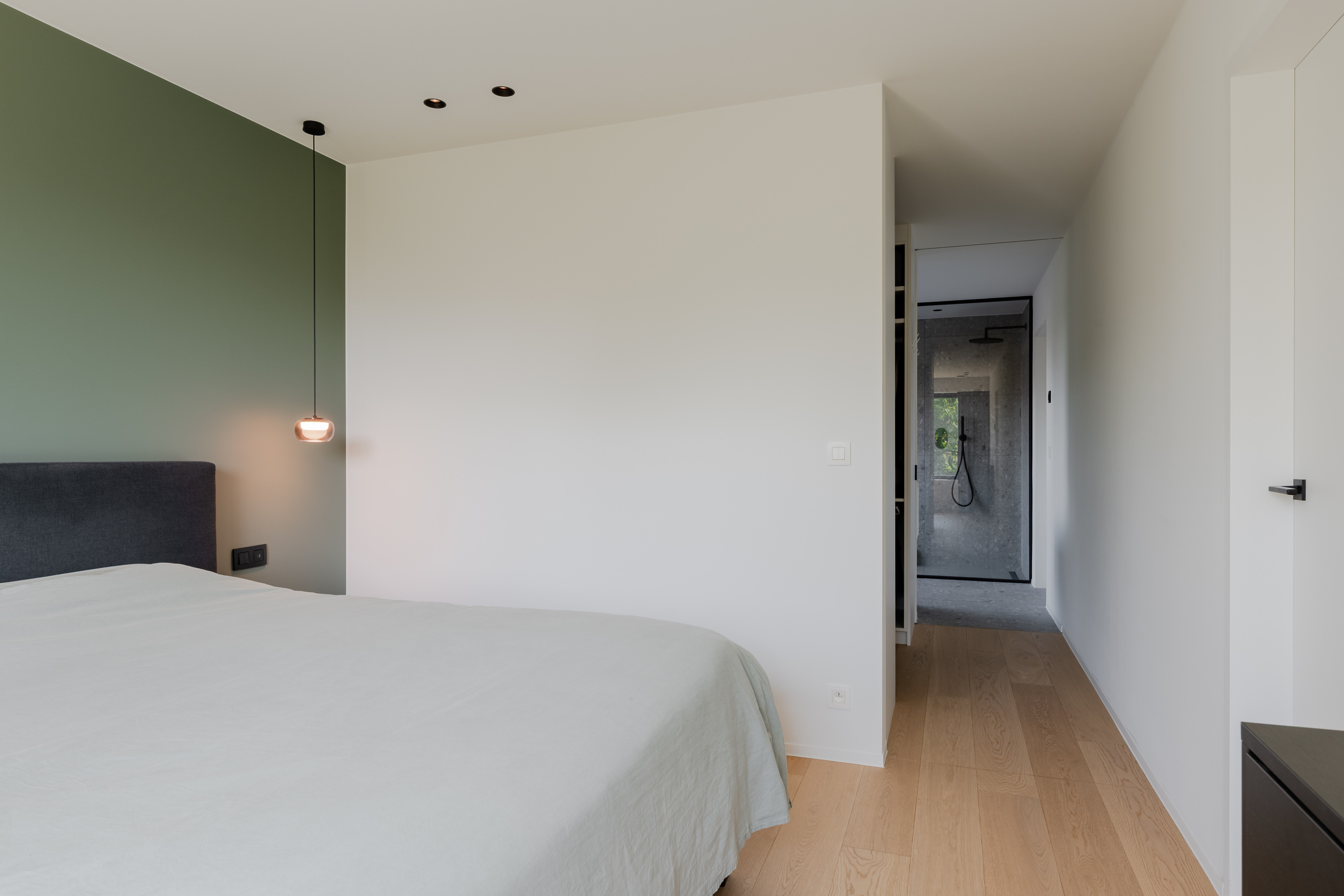 Deze nieuwbouw woning in Mariakerke is een perfecte balans tussen esthetiek en praktisch gebruiksgemak. De voorgevel speelt met volumes, waarbij de inkom en carport subtiel zijn geïntegreerd in het ontwerp. Aluminium gevelbekleding geeft de woning een moderne uitstraling en zorgt ervoor dat de fietsenberging naadloos in de gevel opgaat, wat de architecturale zuiverheid versterkt. Het doorlopende raam in de nachthal, dat doorloopt tot de dakrand, is een opvallend detail en accentueert het unieke karakter van de woning.