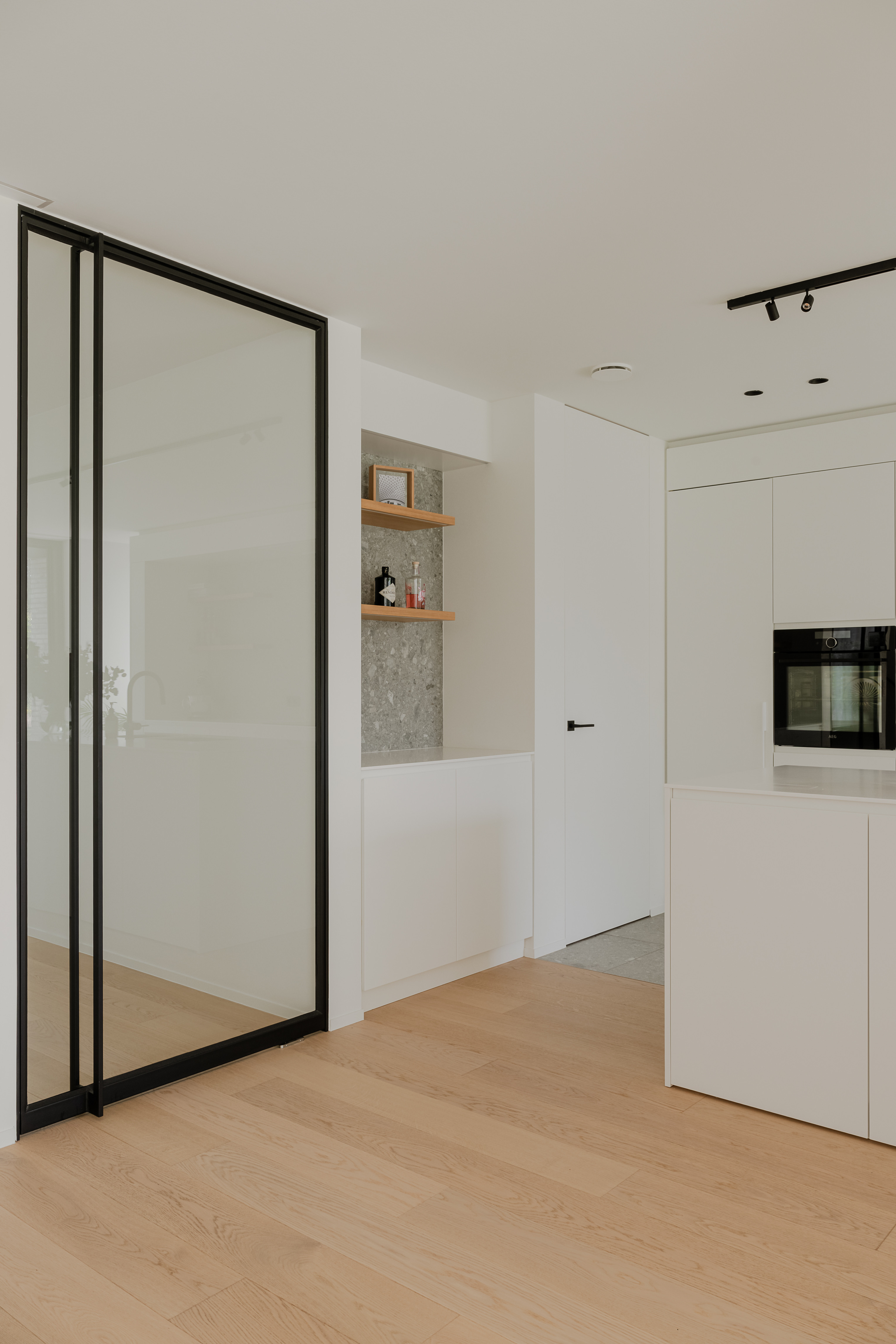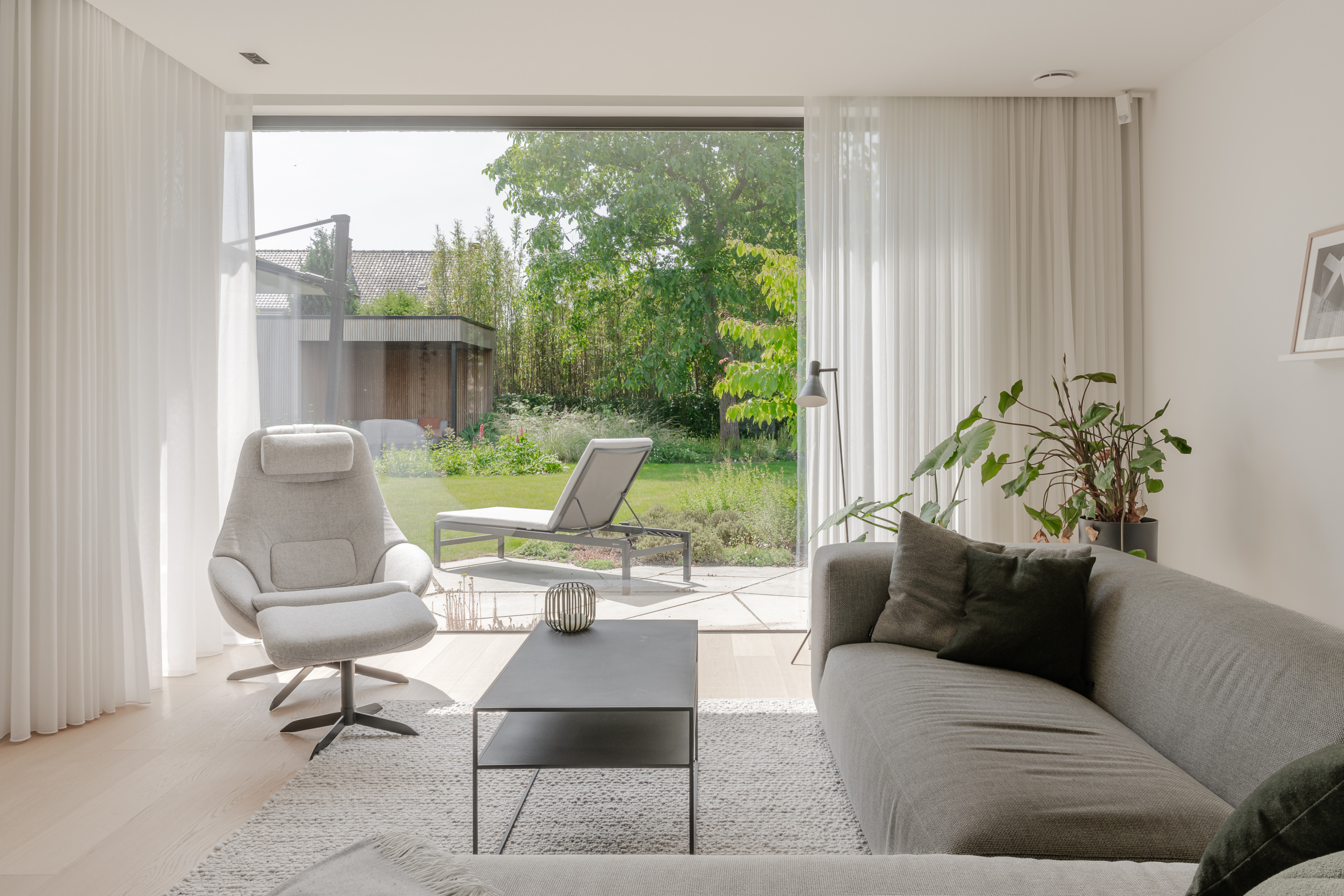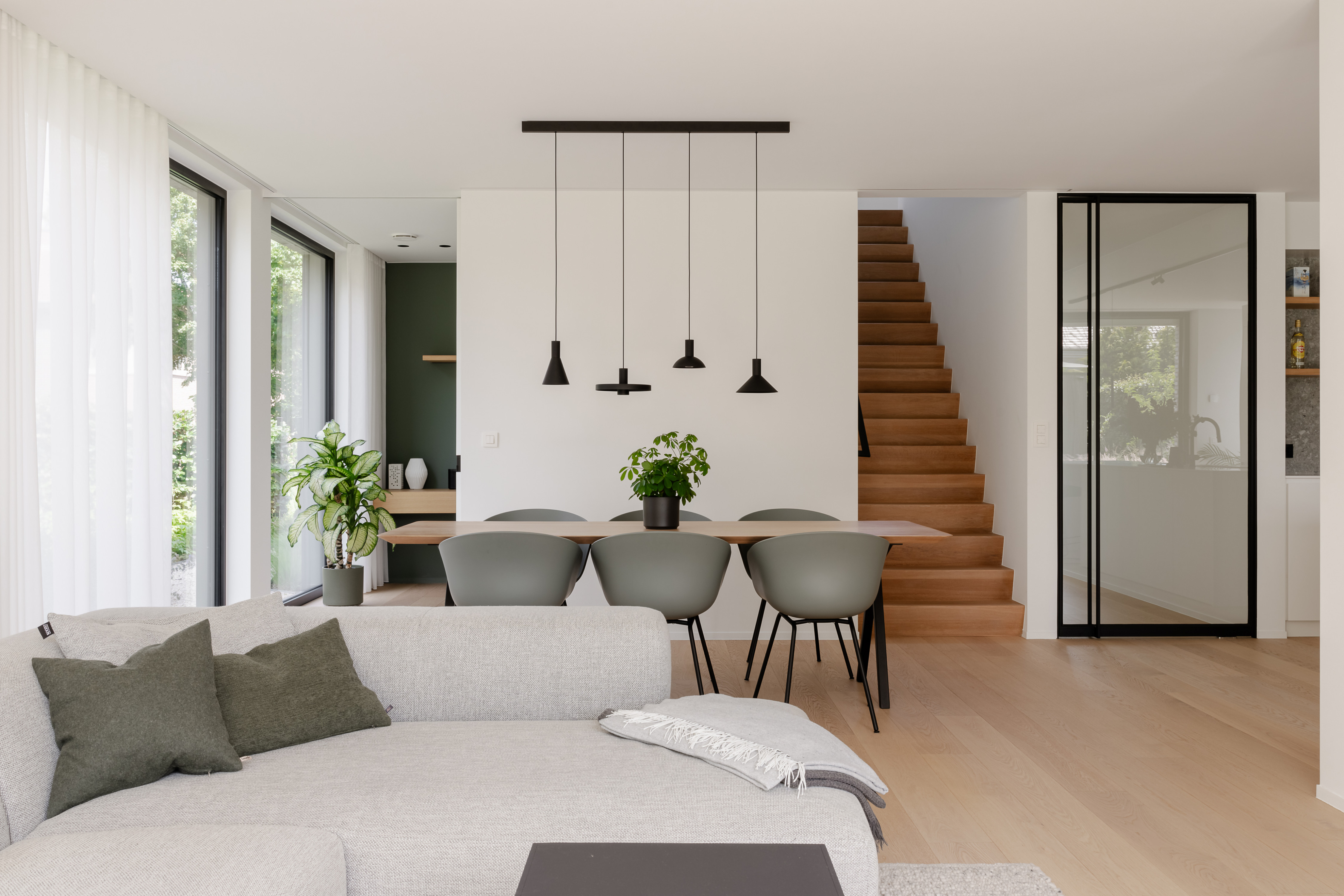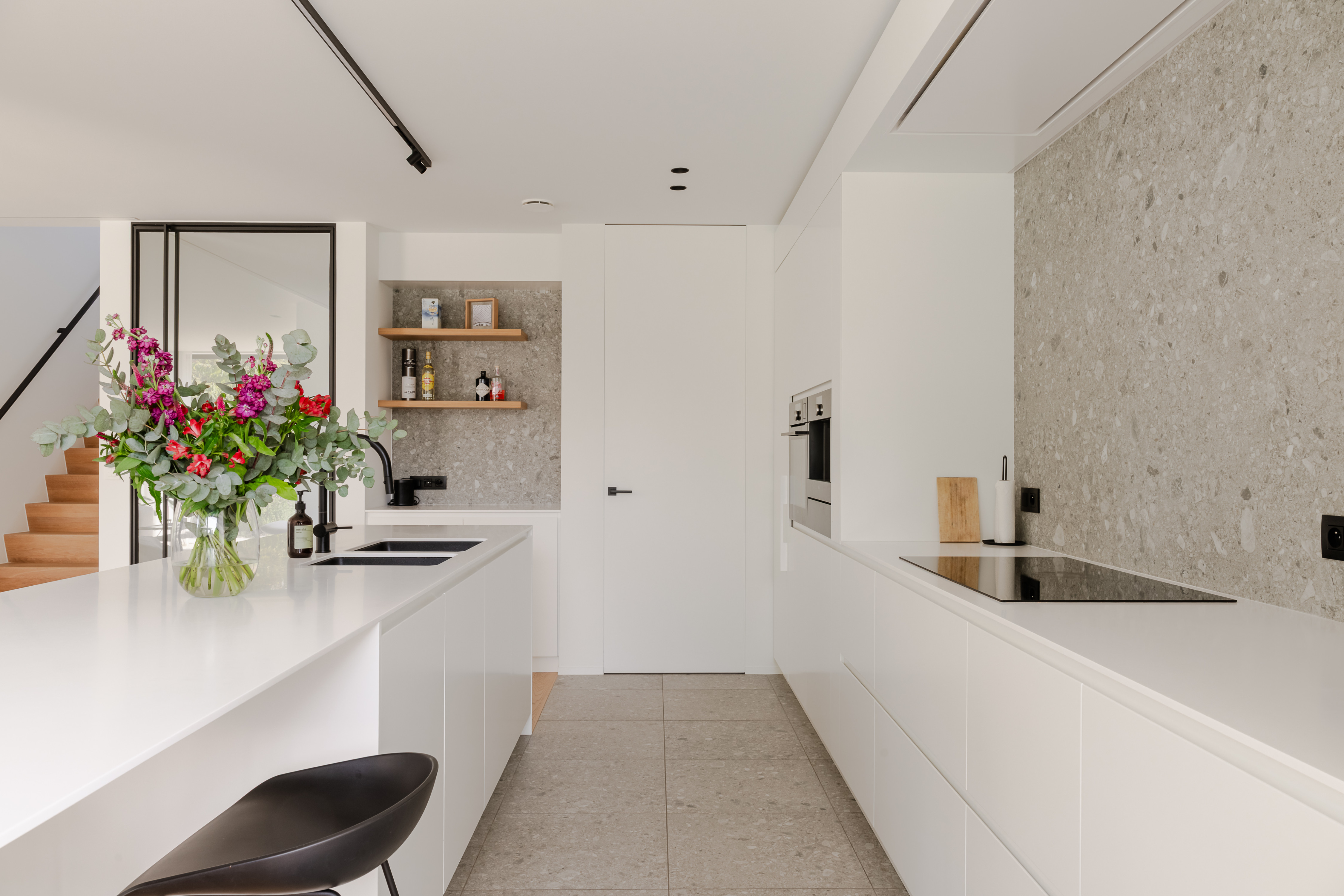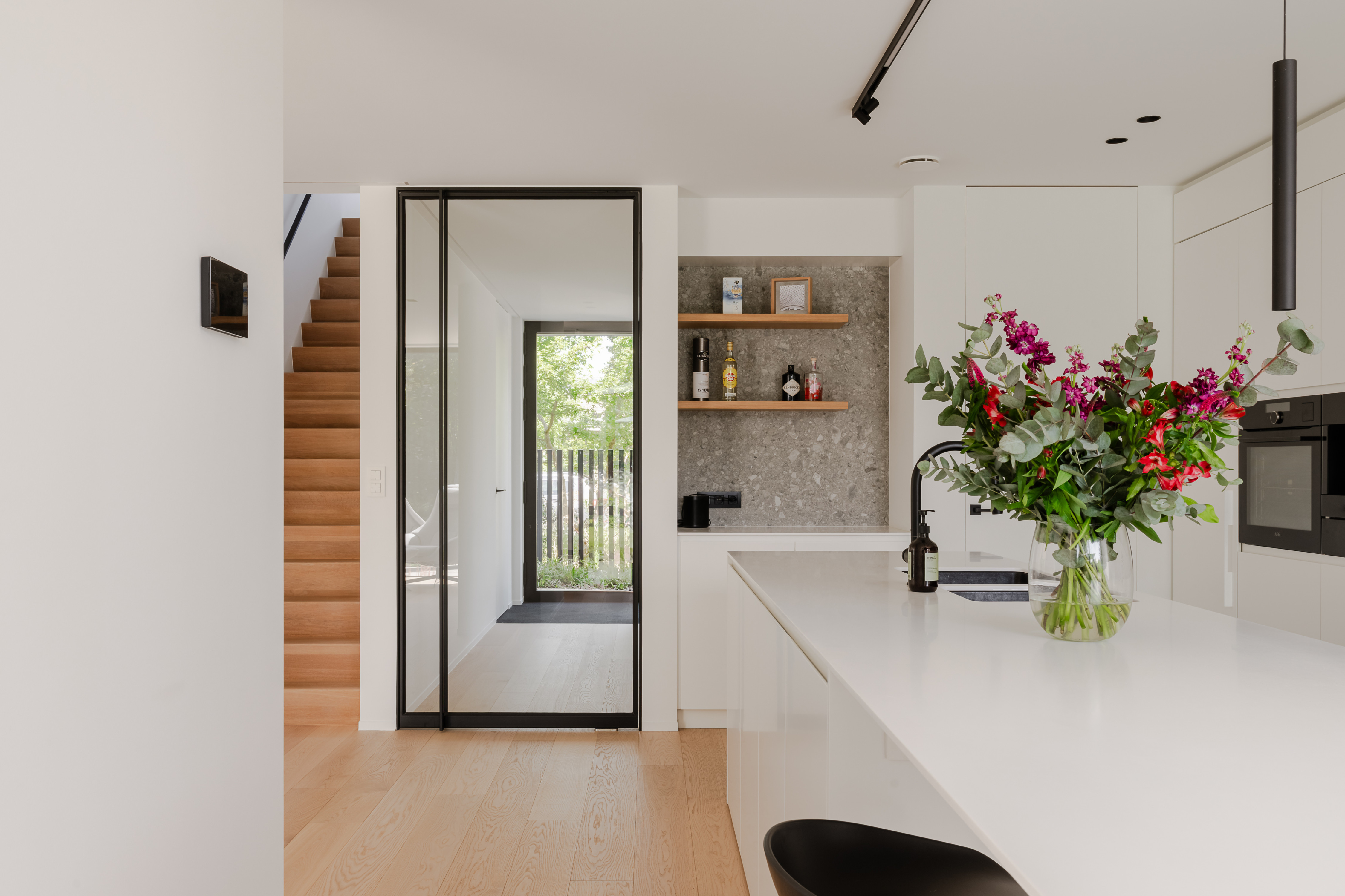 De open leefruimte en keuken vormen een harmonieus geheel, waarbij een centraal maatwerkelement de ruimtes van elkaar afscheidt maar ook met elkaar verbindt. De keuze van de materialen voor het interieur en het maatwerk creëert een interieur dat visueel in balans is. De afsluitbare bureauruimte voegt flexibiliteit toe, zodat de bewoners de woning naar wens kunnen aanpassen aan hun dagelijkse behoeften.
