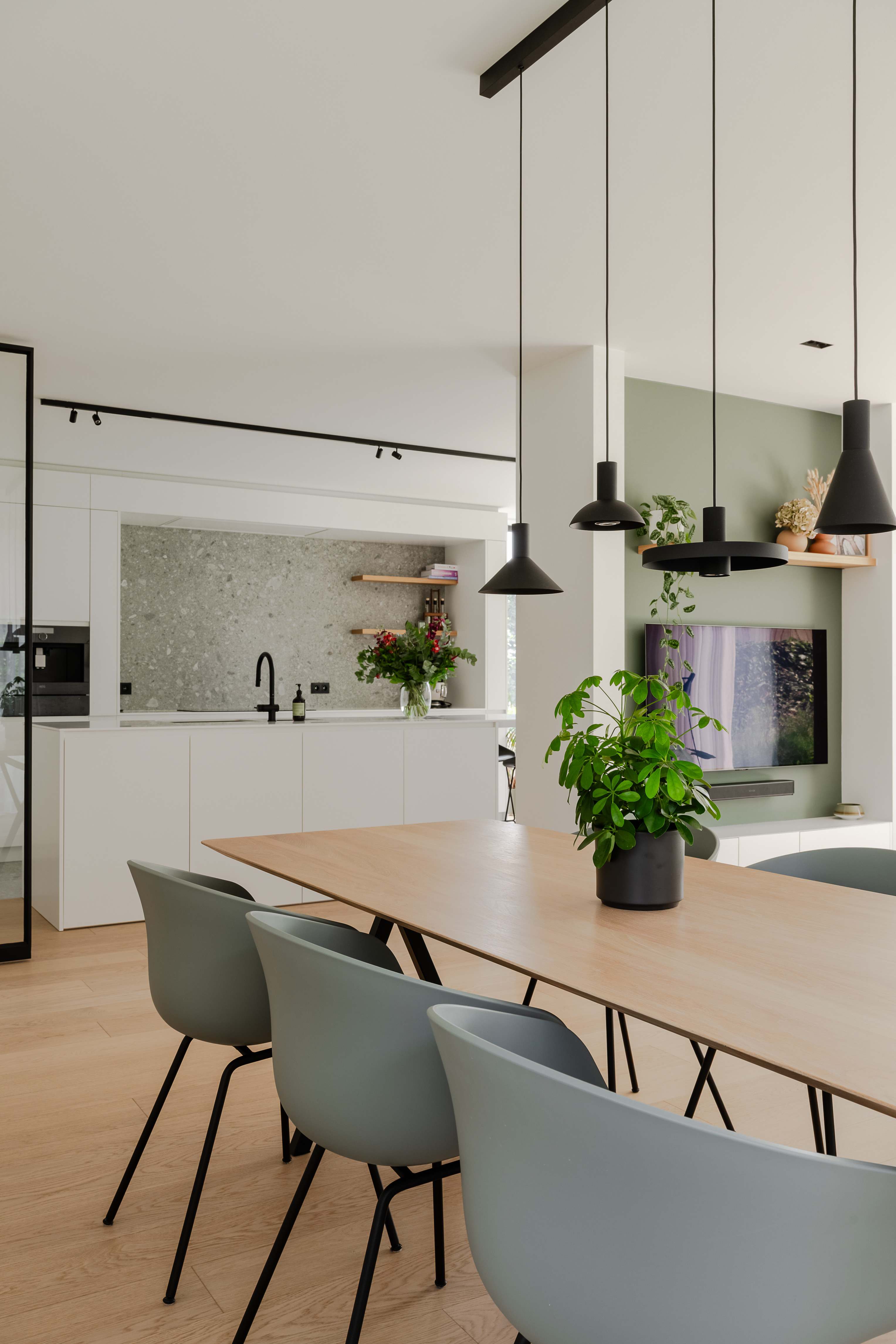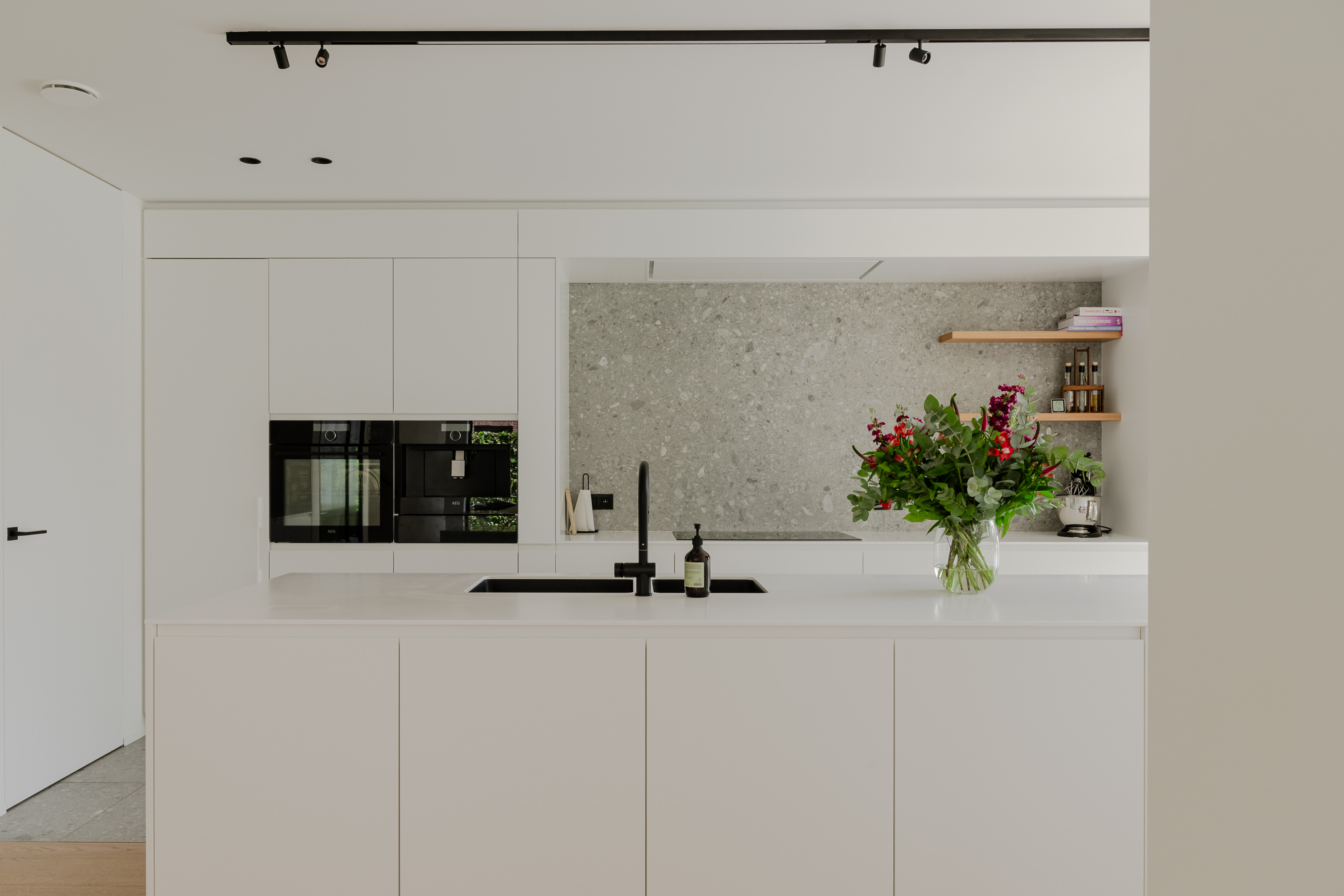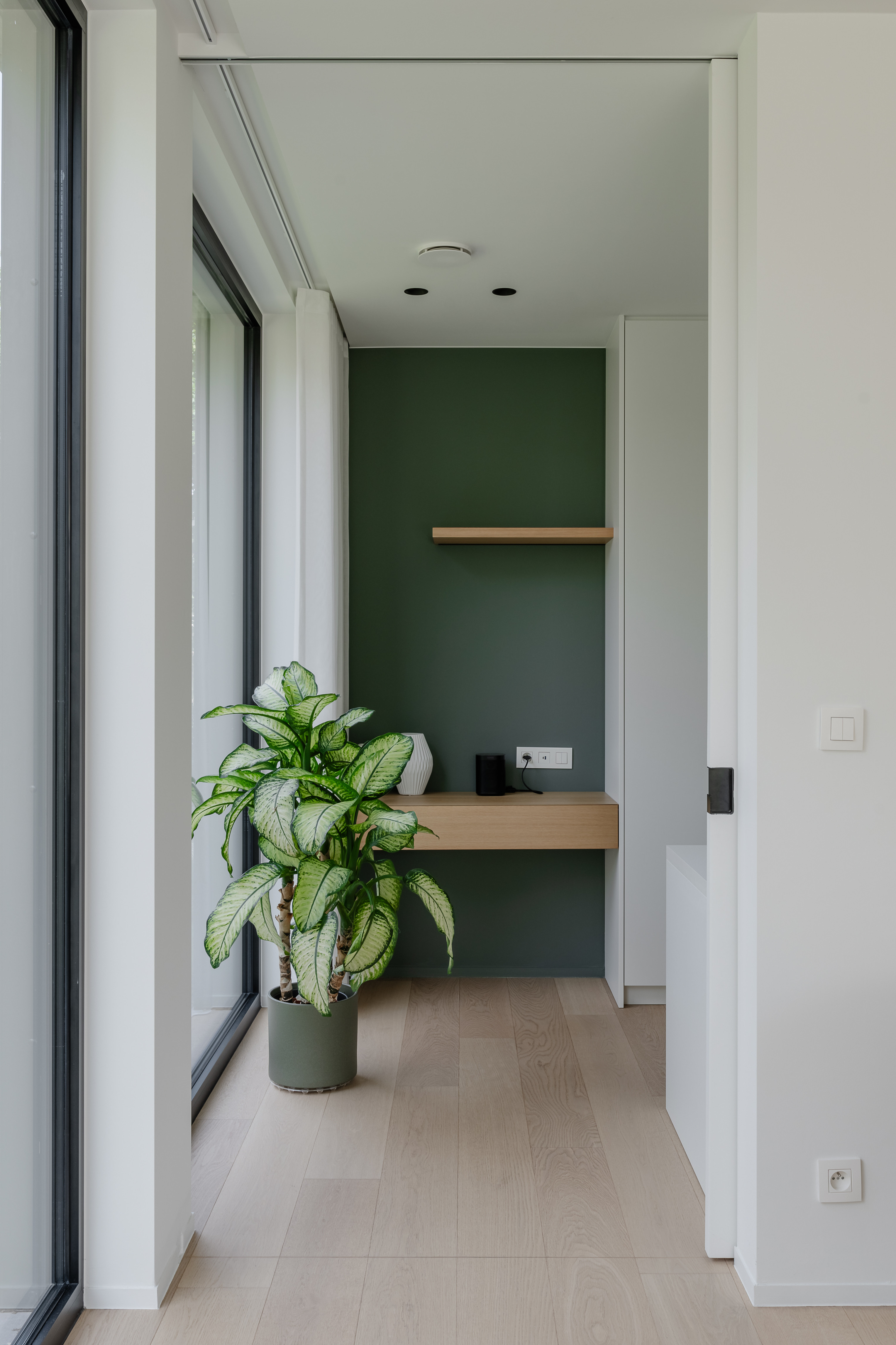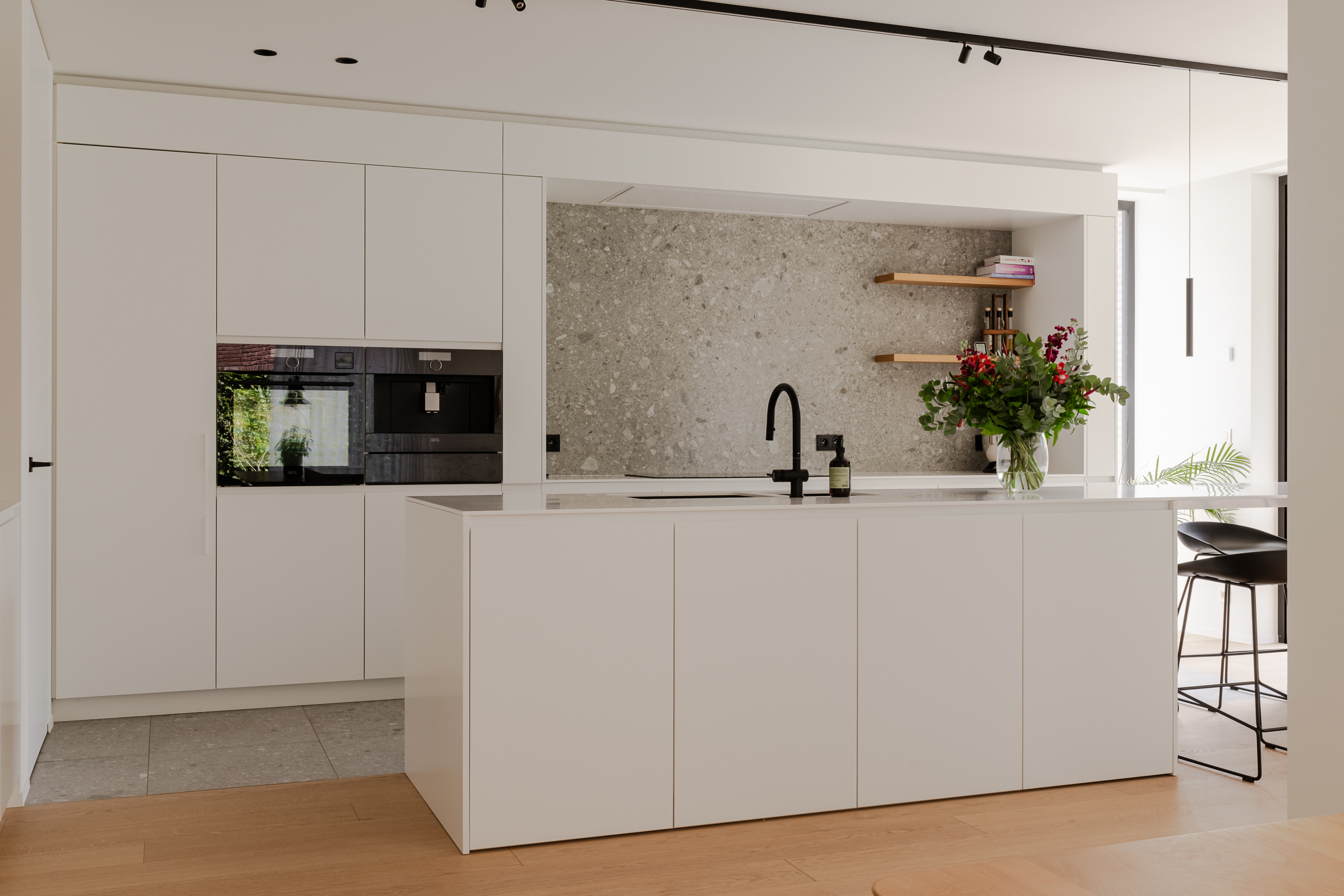 De open leefruimte en keuken vormen een harmonieus geheel, waarbij een centraal maatwerkelement de ruimtes van elkaar afscheidt maar ook met elkaar verbindt. De keuze van de materialen voor het interieur en het maatwerk creëert een interieur dat visueel in balans is. De afsluitbare bureauruimte voegt flexibiliteit toe, zodat de bewoners de woning naar wens kunnen aanpassen aan hun dagelijkse behoeften.