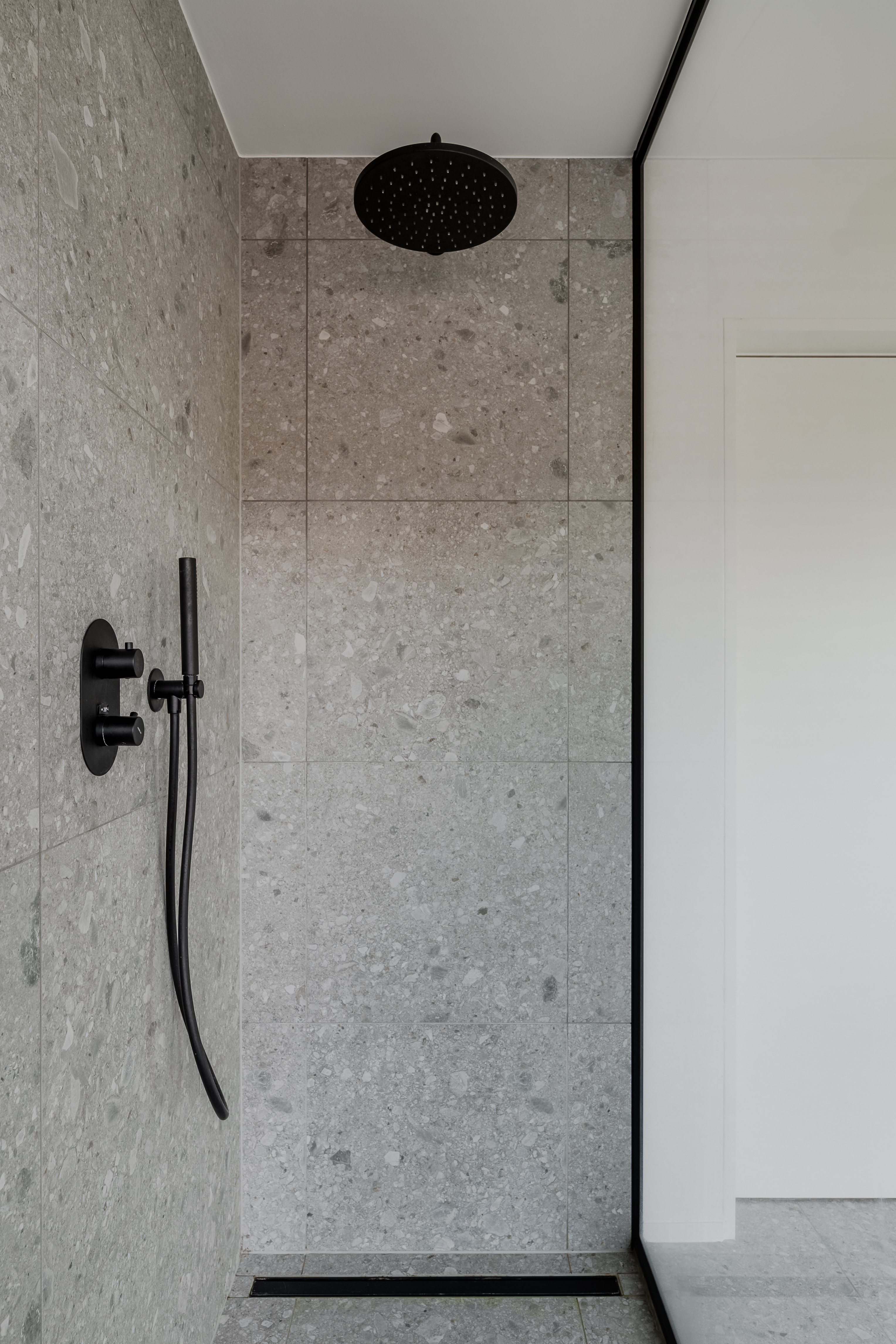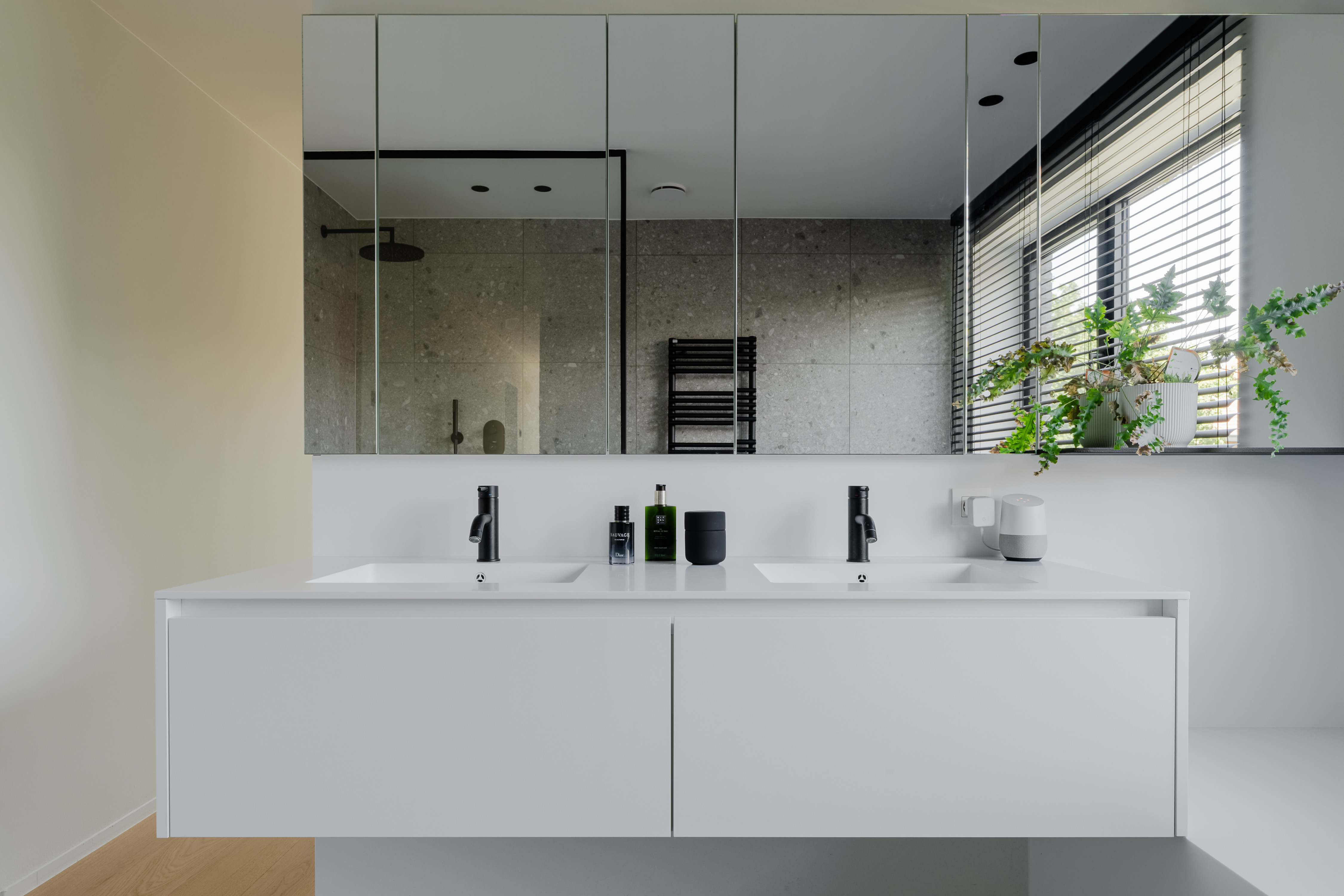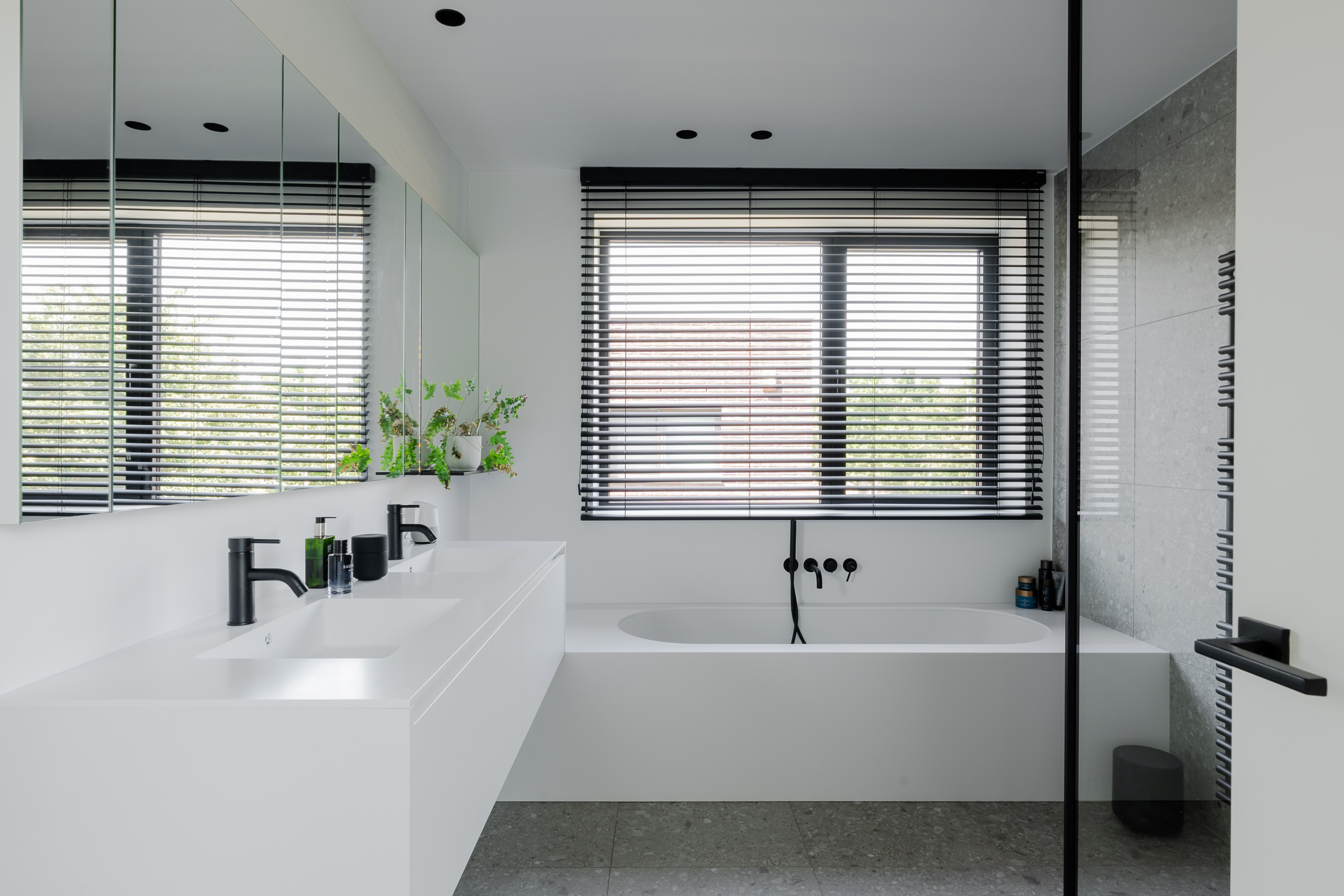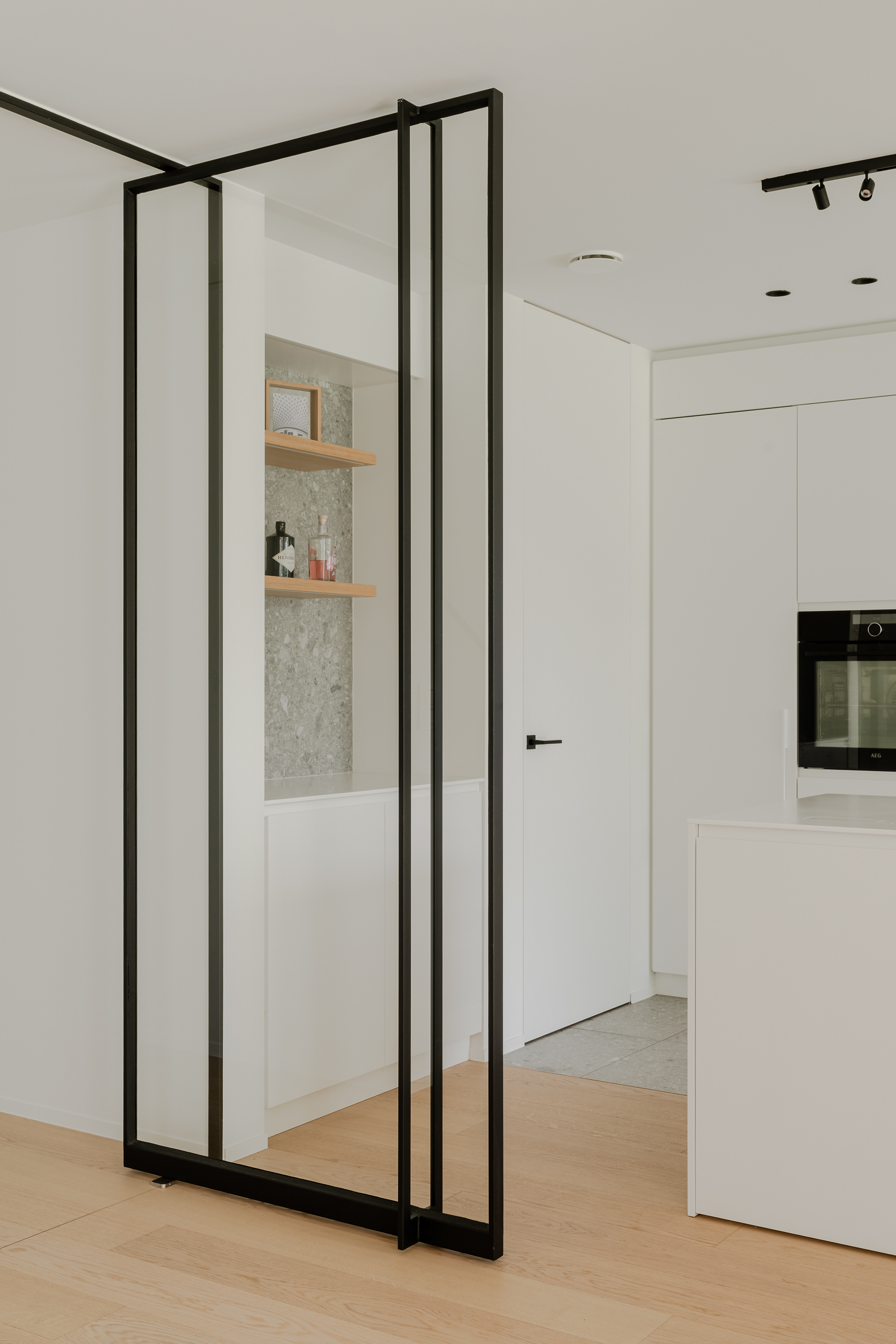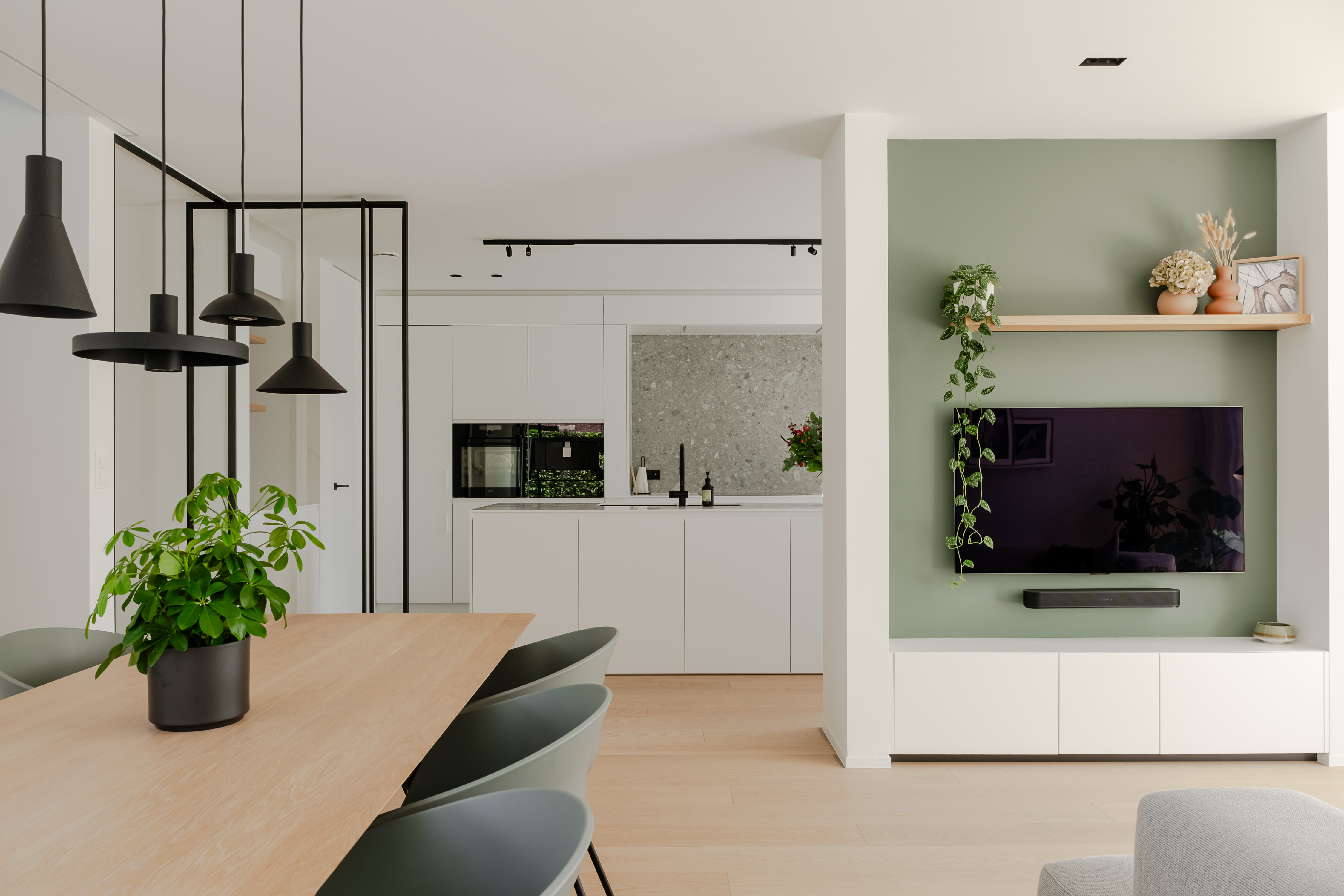 De open leefruimte en keuken vormen een harmonieus geheel, waarbij een centraal maatwerkelement de ruimtes van elkaar afscheidt maar ook met elkaar verbindt. De keuze van de materialen voor het interieur en het maatwerk creëert een interieur dat visueel in balans is. De afsluitbare bureauruimte voegt flexibiliteit toe, zodat de bewoners de woning naar wens kunnen aanpassen aan hun dagelijkse behoeften.